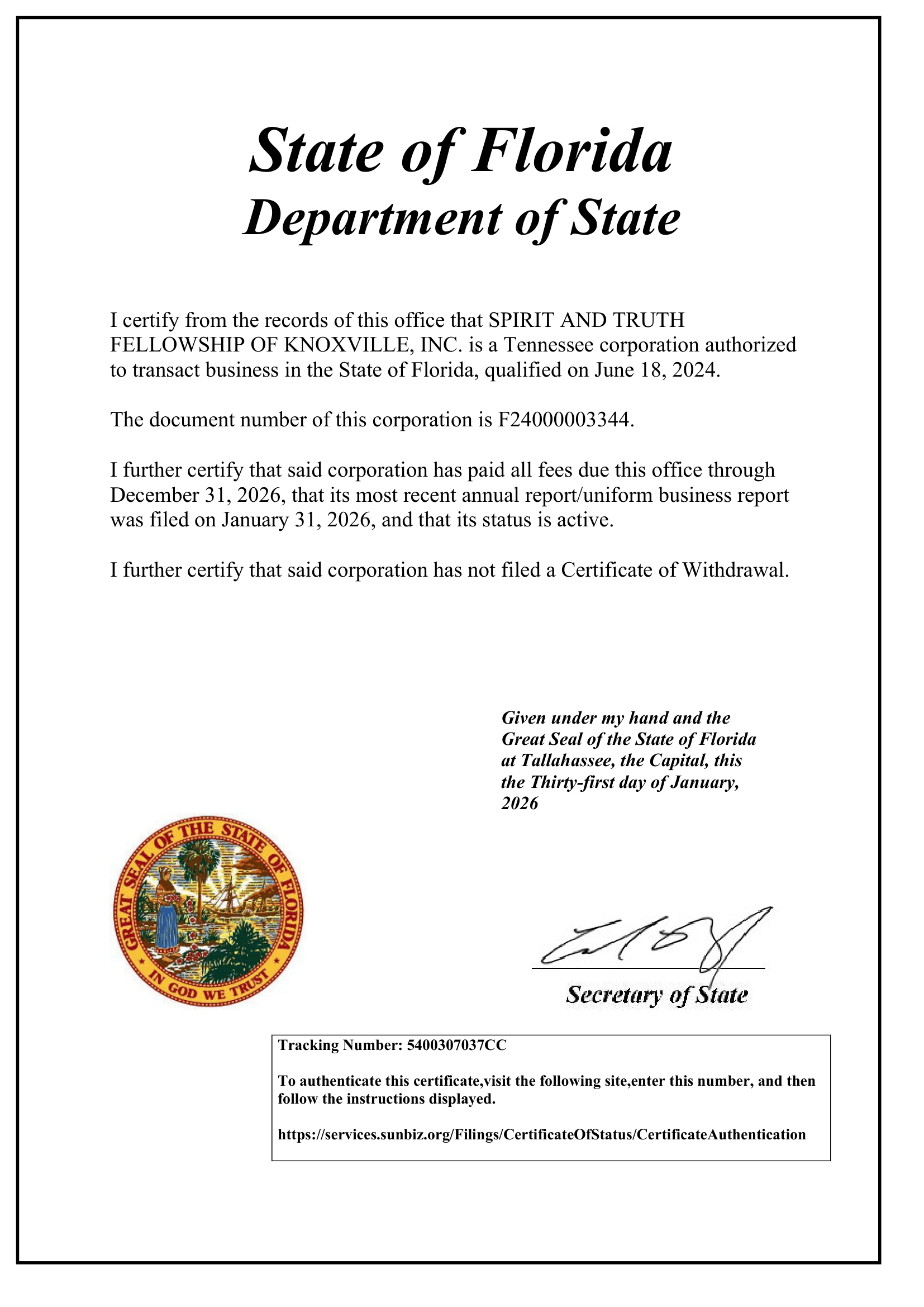 As of June 18, 2024, STFK is authorized to transact business in Florida as Spirit and Truth Fellowship of Knoxville, Inc.